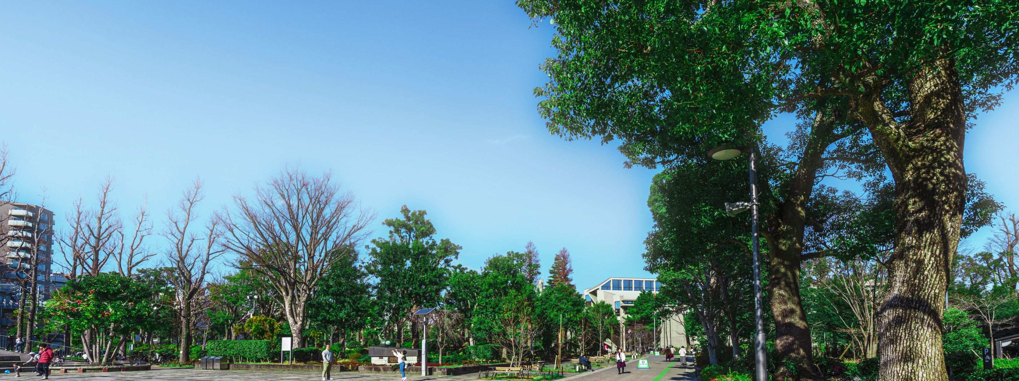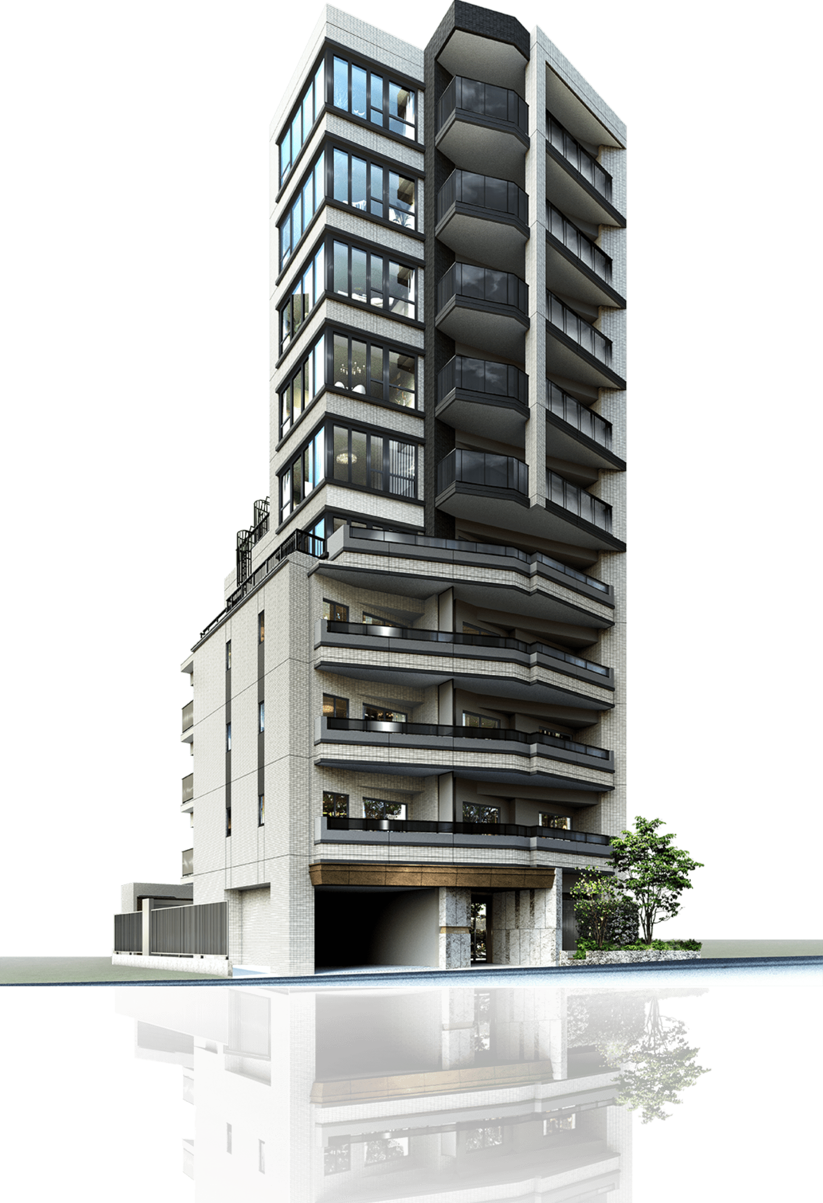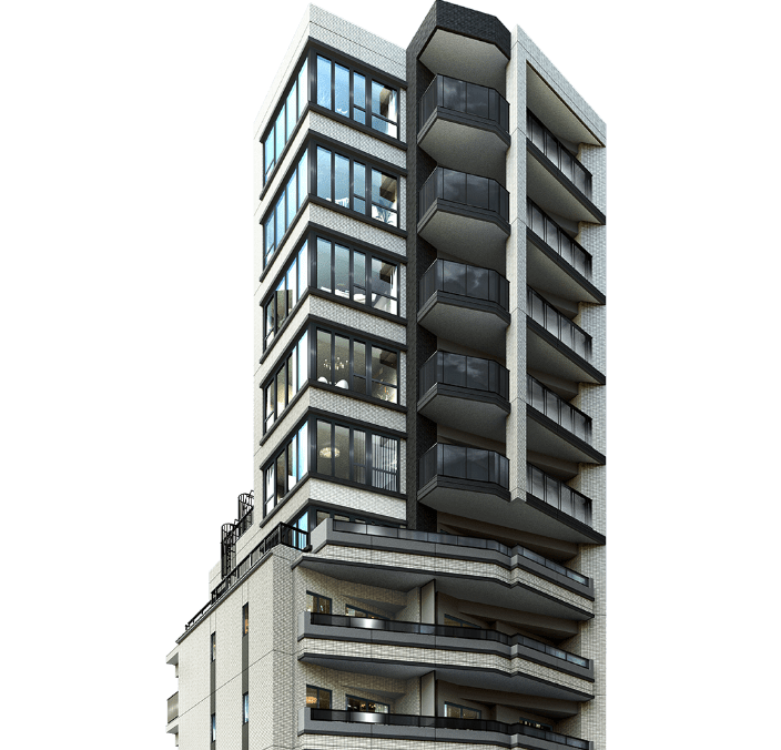 ※掲載の外観完成予想CGは計画段階の図面を基に書き起こしたもので、形状・色味等は実際と異なります。外観形状の細部、エアコン室外機、照明、避雷針等、一部省略、または簡略して おります。表現されている敷地内の植栽は、 竣工から初期の育成期間を経た状態のものを想定して描いており、竣工時は植栽の育成を見込んで必要な間隔を取って植えております。設計・施工上の都合により、設定位置・樹高・ 本数等変更される場合があります。植栽は、実際に植樹する植栽と樹形、枝ぶり、葉や色合いが異なる場合があります。また特定の季節の状況を示すものではありません。尚、竣工時には完成予想CG程度には成長しておりません。